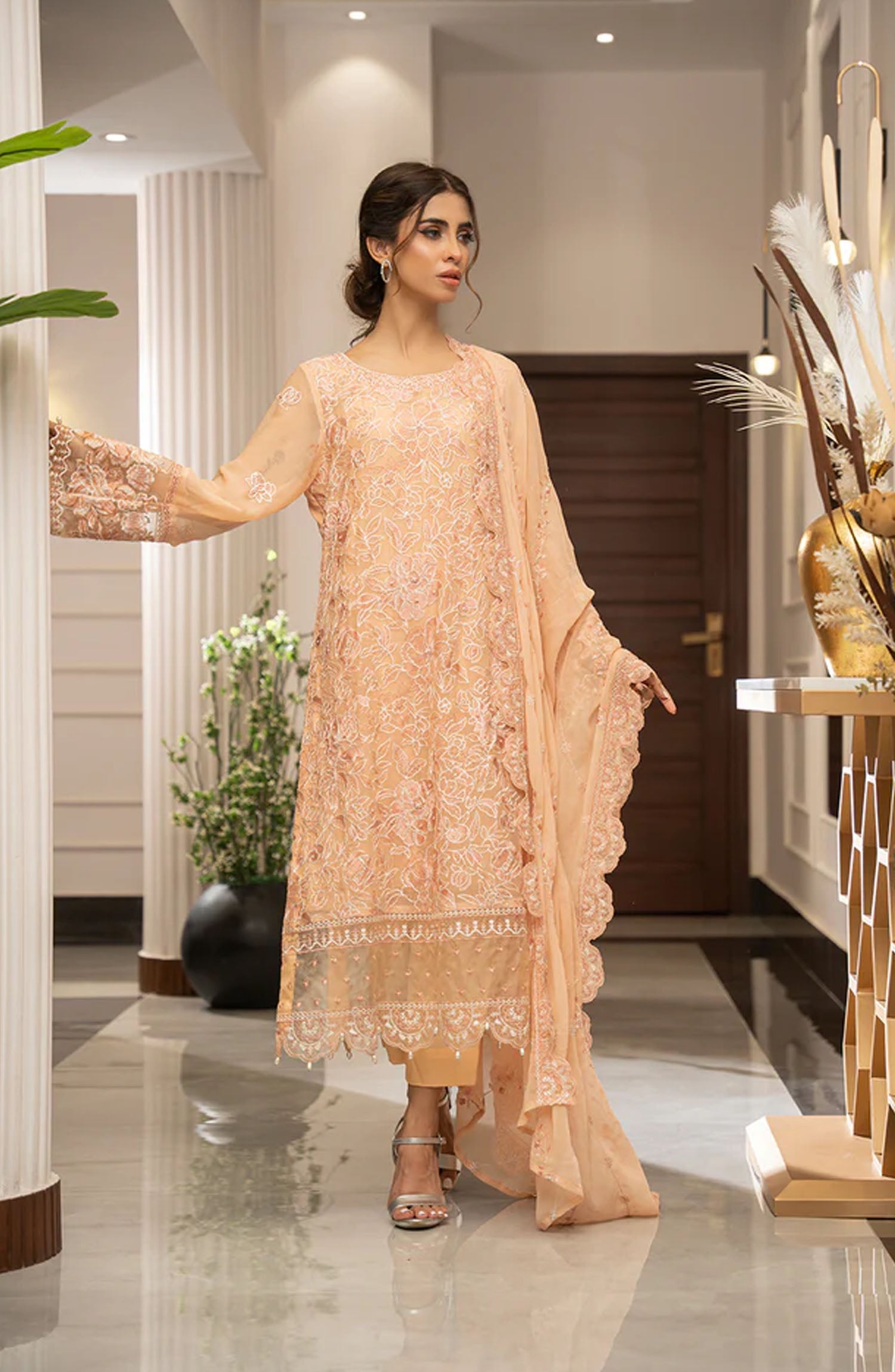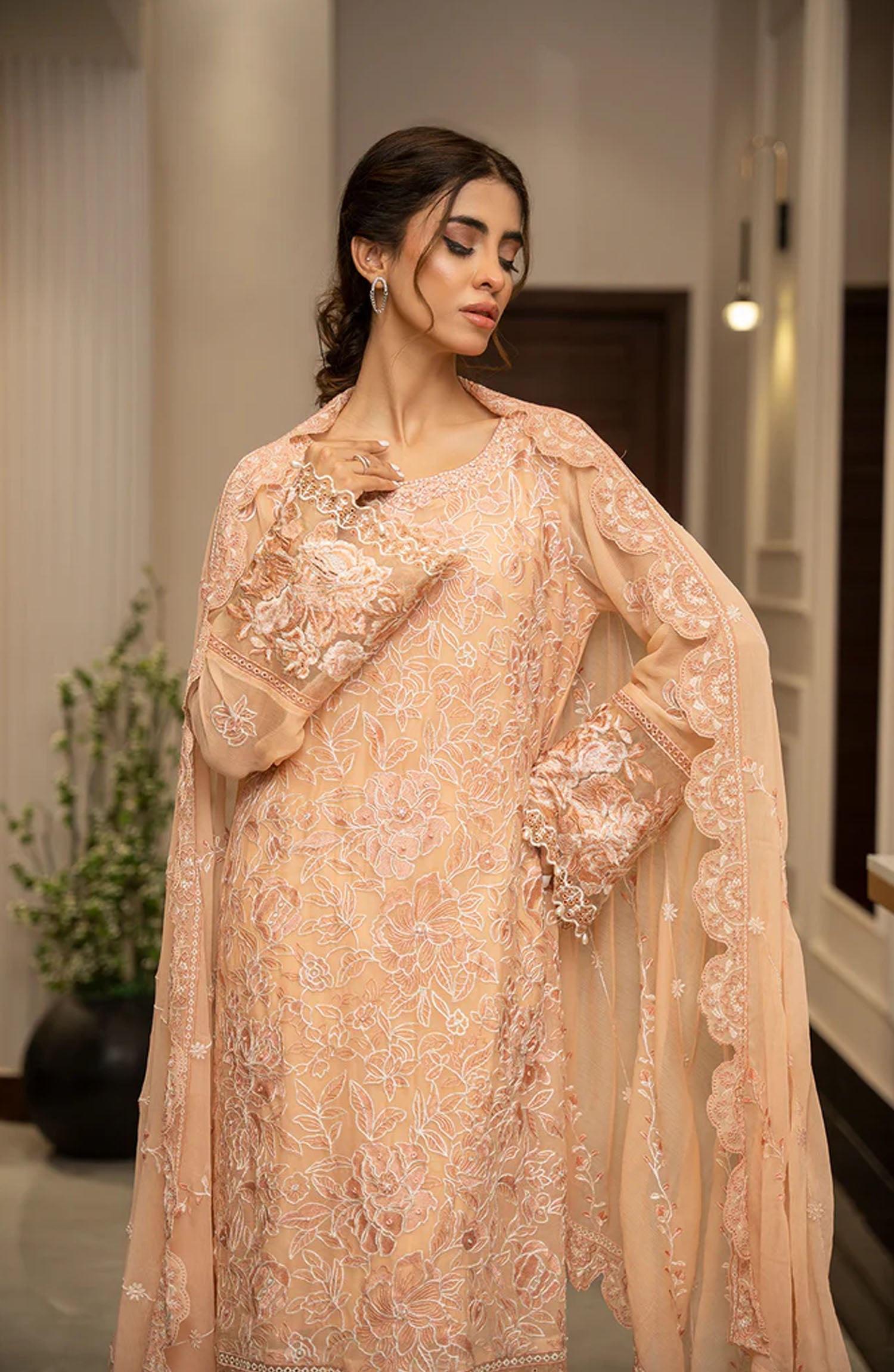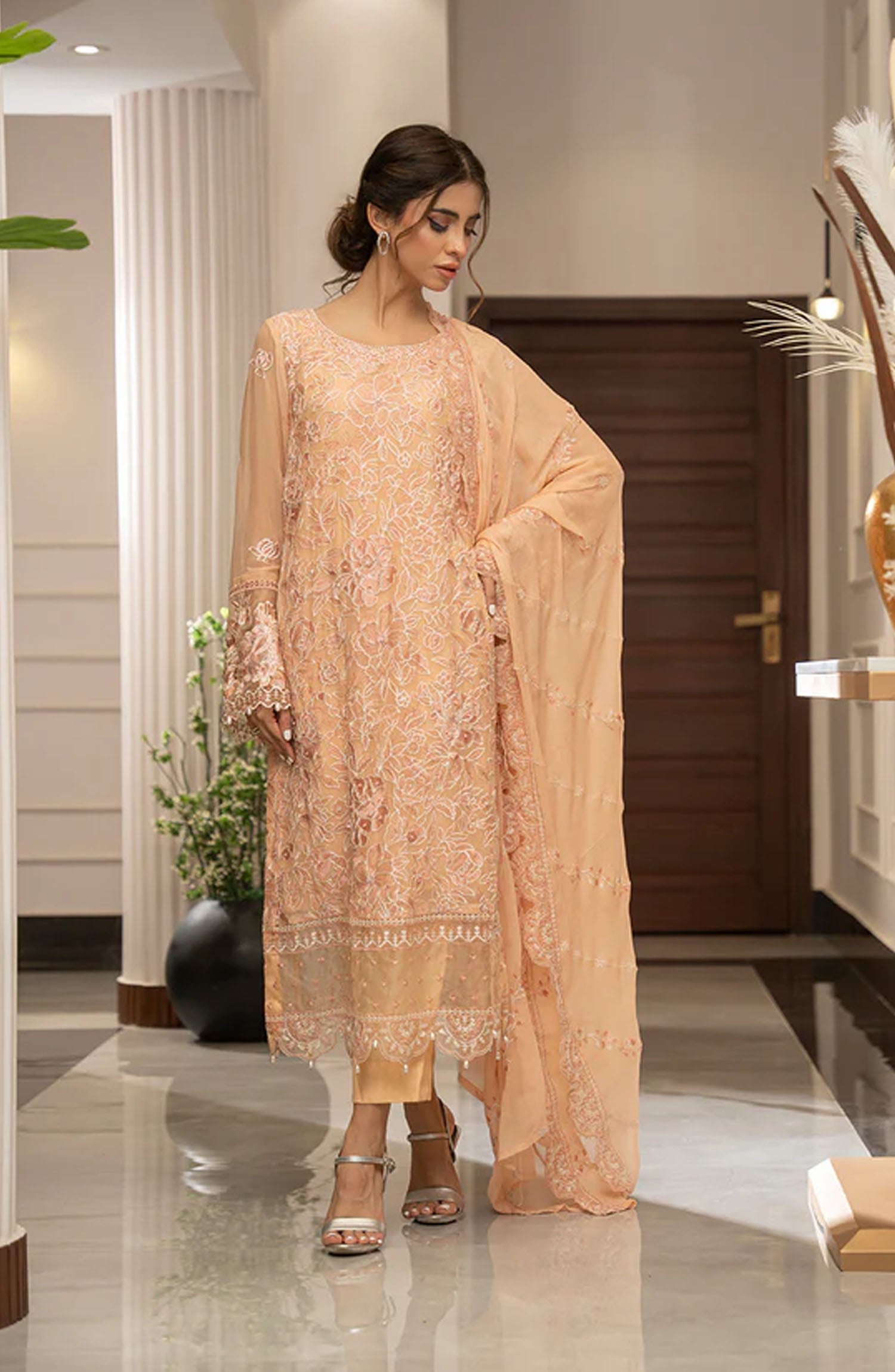 Zouj Embroidered Chiffon Unstitched 4 Piece Suit - Serene Peach - ZJ25EUCE - Peach - Festive Collection