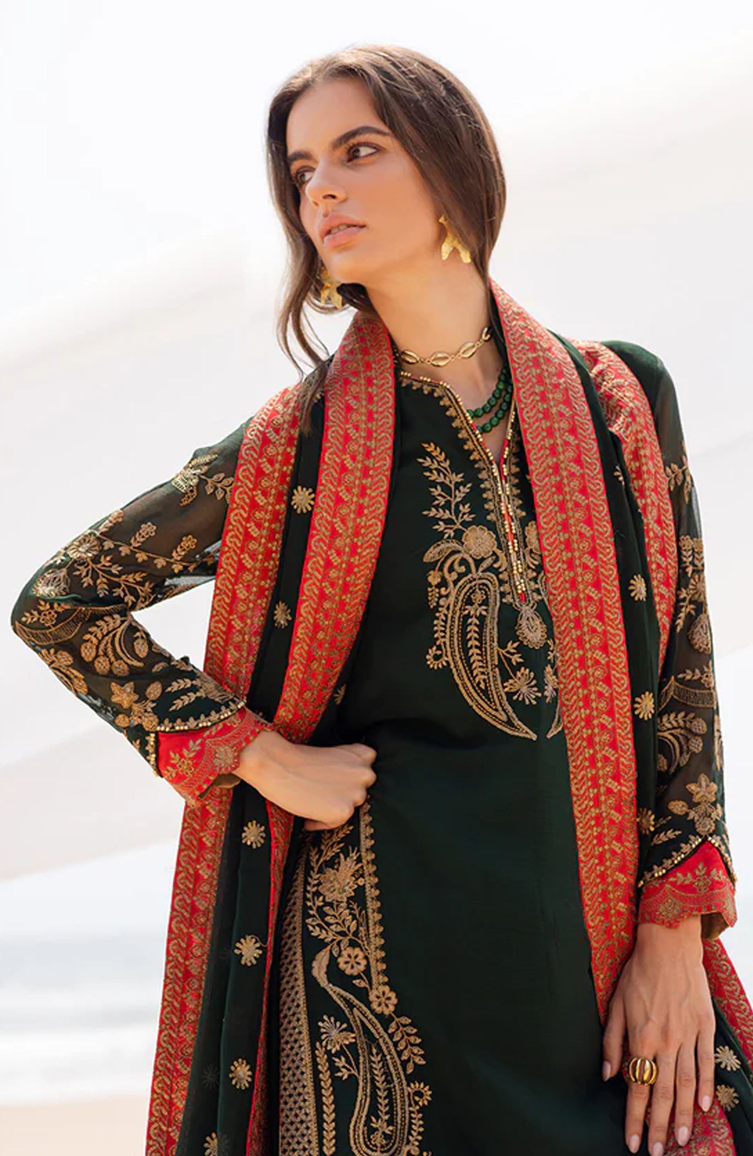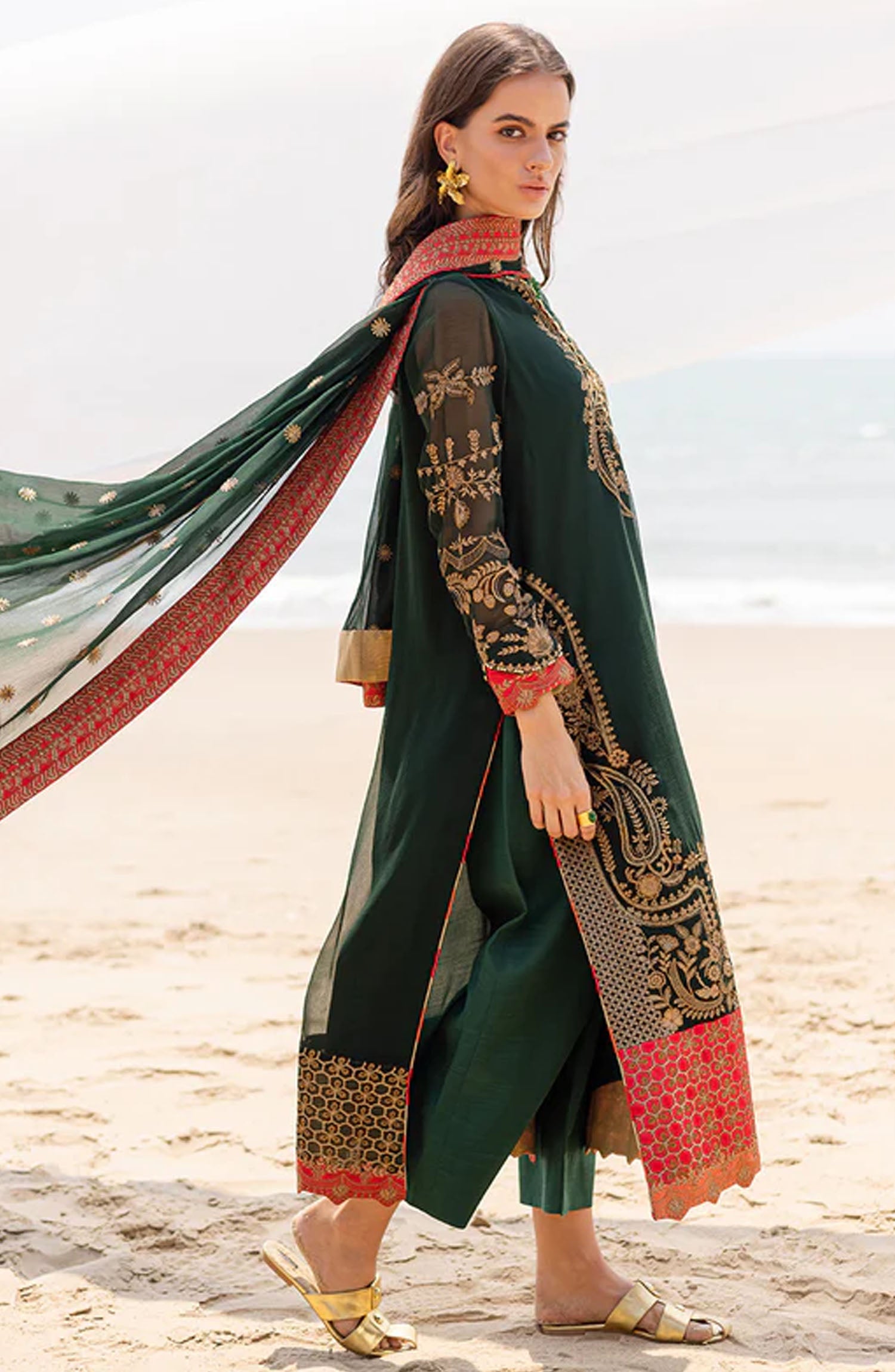 The standard style comes as a long-sleeved kameez with dupatta and trouser/shawlar.